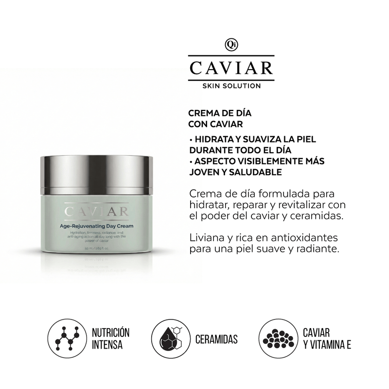 La Crema de Día Antiedad Caviar es una crema facial de día de textura ligera para uso diario, formulada con extracto de caviar, ácido hialurónico, extracto de algas y ceramidas. Aporta hidratación profunda, ayuda a reforzar la barrera cutánea y contribuye a mejorar el aspecto de luminosidad y firmeza para una piel más suave y radiante.