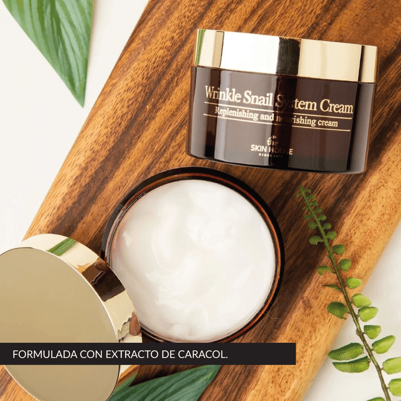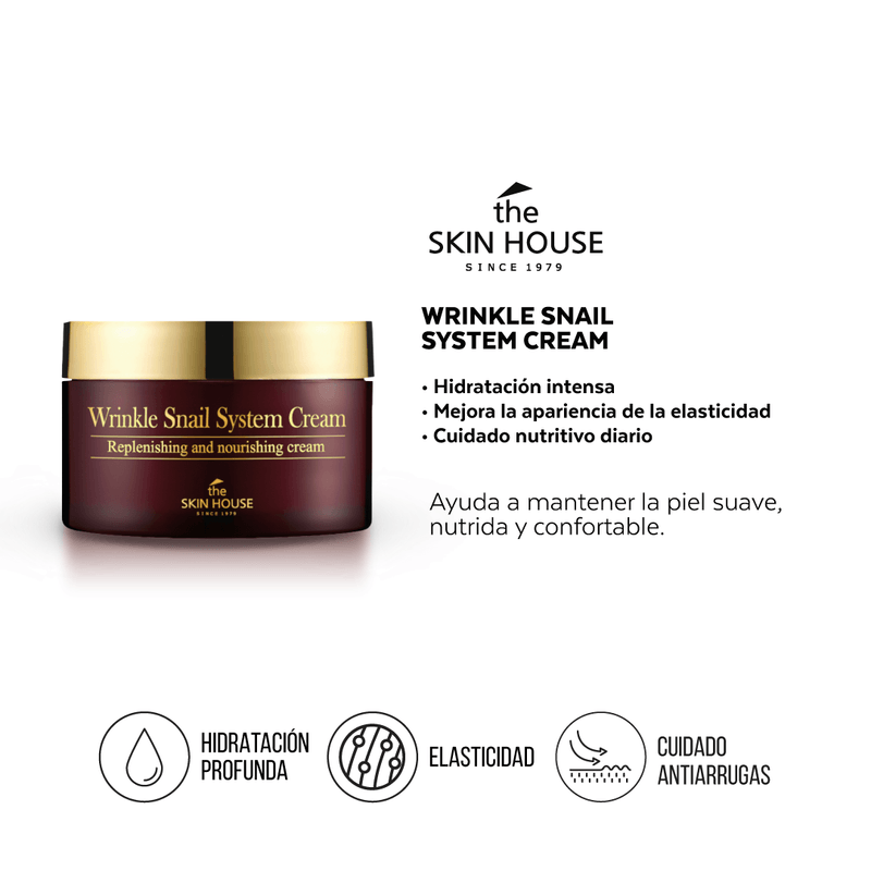 The Skin House Wrinkle Snail System Cream 50 ml es una crema facial coreana antiarrugas formulada con mucina de caracol, adenosina y aloe vera. Ayuda a mantener la piel hidratada y a mejorar la apariencia de elasticidad, como parte de una rutina de cuidado antiage.