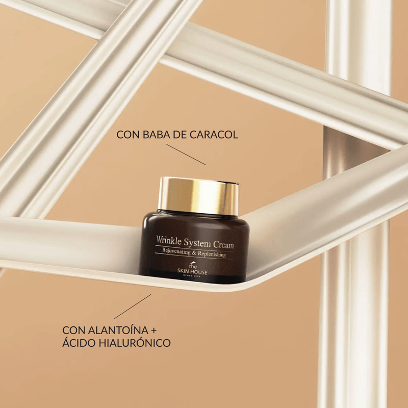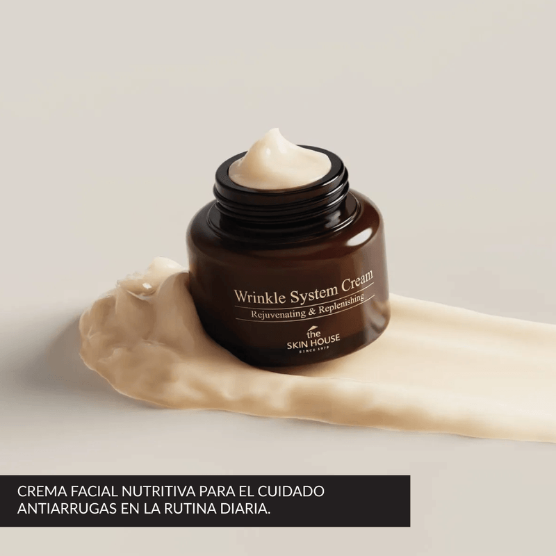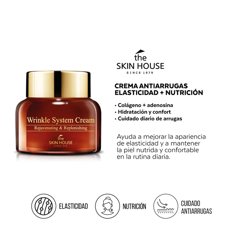 The Skin House Wrinkle System Cream 50 g es una crema facial coreana antiarrugas formulada con colágeno, adenosina y baba de caracol para acompañar el cuidado de líneas finas y arrugas, ayudando a mejorar la apariencia de elasticidad y firmeza con nutrición e hidratación.