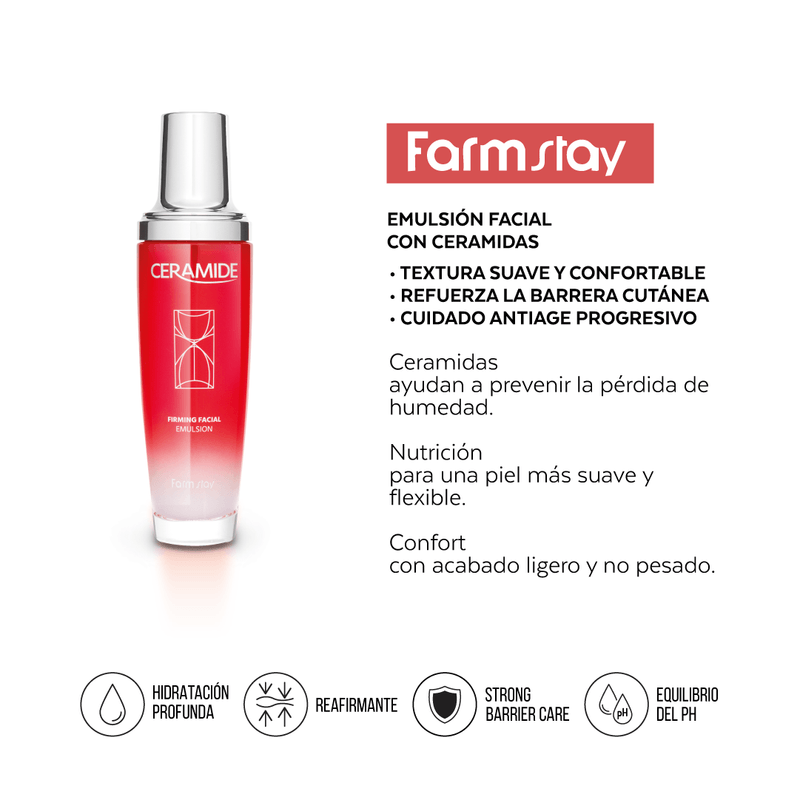 La Farmstay Ceramide Firming Facial Emulsion 130 ml es una emulsión facial con ceramidas que ayuda a mantener la hidratación de la piel y reforzar la barrera cutánea. Aporta nutrición y contribuye a una piel más suave, flexible y de aspecto saludable.
