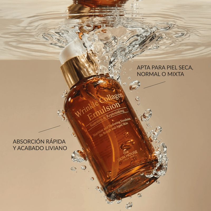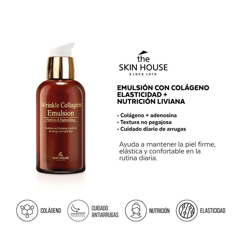 The Skin House Wrinkle Collagen Emulsion 130 ml es una emulsión facial coreana con colágeno y adenosina para el cuidado antiage. Su textura liviana y no pegajosa aporta nutrición e hidratación, ayudando a mejorar la apariencia de elasticidad y acompañar el cuidado de líneas finas y arrugas.