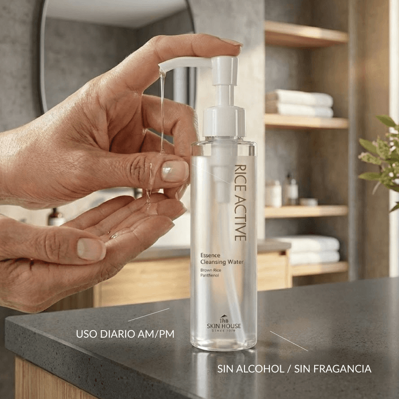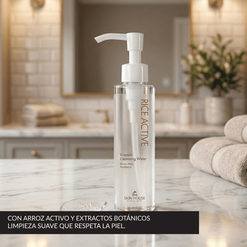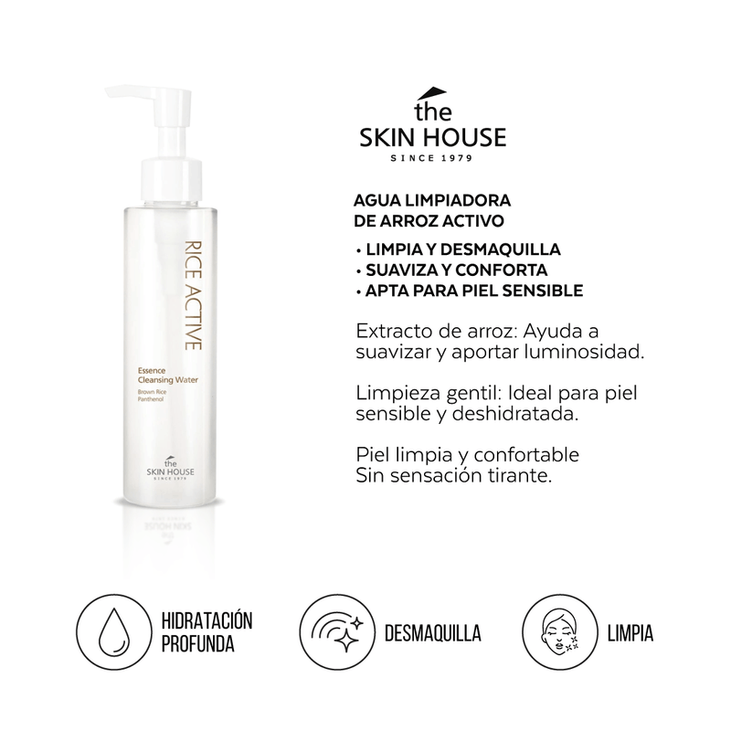 Sumá a tu rutina una agua limpiadora coreana ideal para desmaquillar y limpiar sin resecar. La The Skin House Escencia Limp Rice Active 150 ml ayuda a remover maquillaje, impurezas y protector solar, dejando la piel suave, hidratada y con mejor luminosidad. Ideal si buscás un limpiador facial suave para piel sensible.