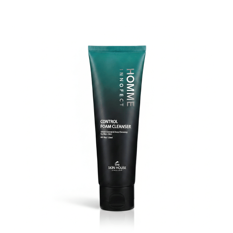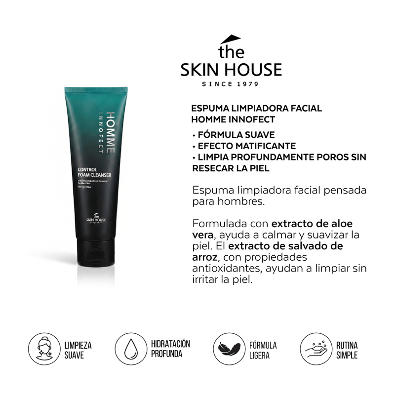 El The Skin House Homme Innofect Control Foam Cleanser es un limpiador facial coreano en espuma desarrollado para hombres, con una fórmula todo en uno que limpia la piel y aporta hidratación sin sensación grasa. Contiene niacinamida, pantenol y centella asiática, y está diseñado para una rutina simple y práctica de uso diario.