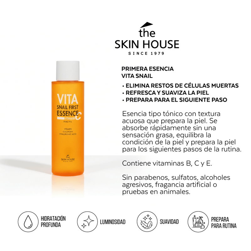 La Vita Snail First Essence de The Skin House tiene textura ligera y acuosa que ayuda a eliminar restos de células muertas, refrescar y suavizar la piel, dejando la superficie lista para los pasos posteriores de la rutina.