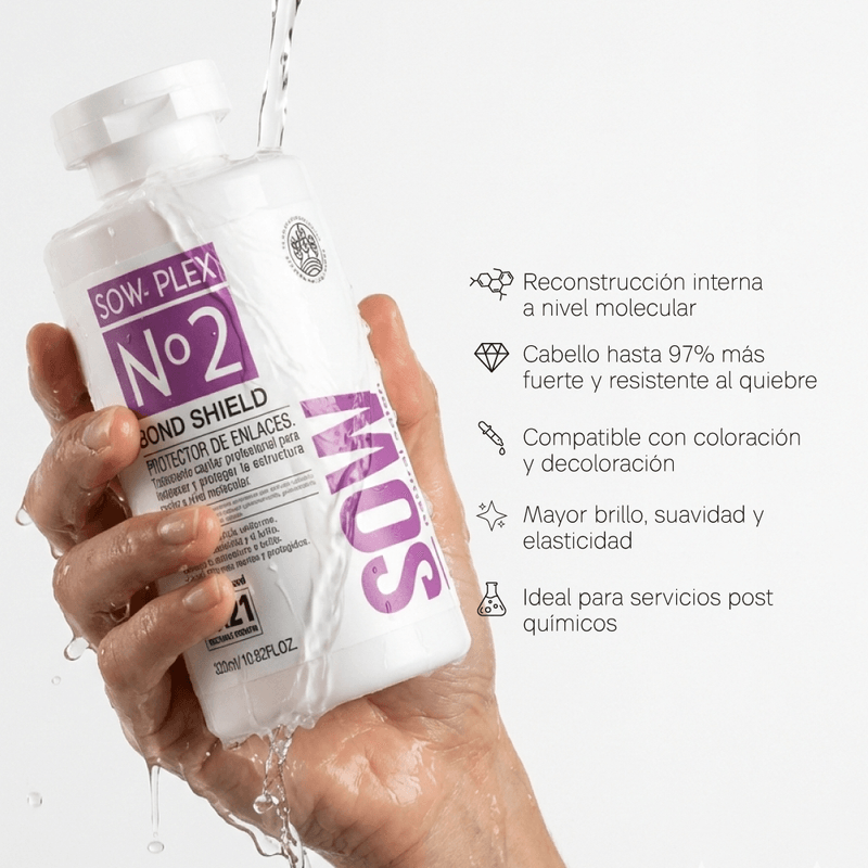 SOW PLEX #2 Bond Shield es un tratamiento plex capilar (protector de enlaces) con efecto reconstructor post procesos oxidativos. Ayuda a sellar las cutículas, crear una superficie uniforme y mejorar la apariencia de flexibilidad y brillo, acompañando la protección de la estructura capilar a nivel molecular. Ideal para servicios post químicos y como paso final del sistema SOW PLEX.