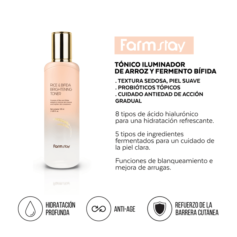 Sumá a tu rutina un tónico facial coreano ideal para hidratar, mejorar la luminosidad y reforzar la barrera cutánea. El Farmstay Rice & Bifida Brightening Toner 120 ml es perfecto si buscás un toner hidratante para piel opaca y deshidratada.